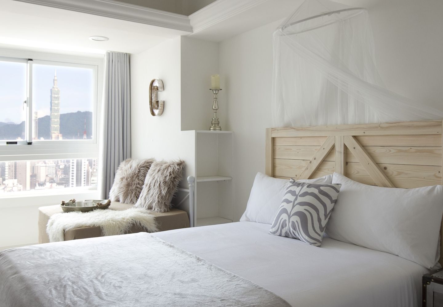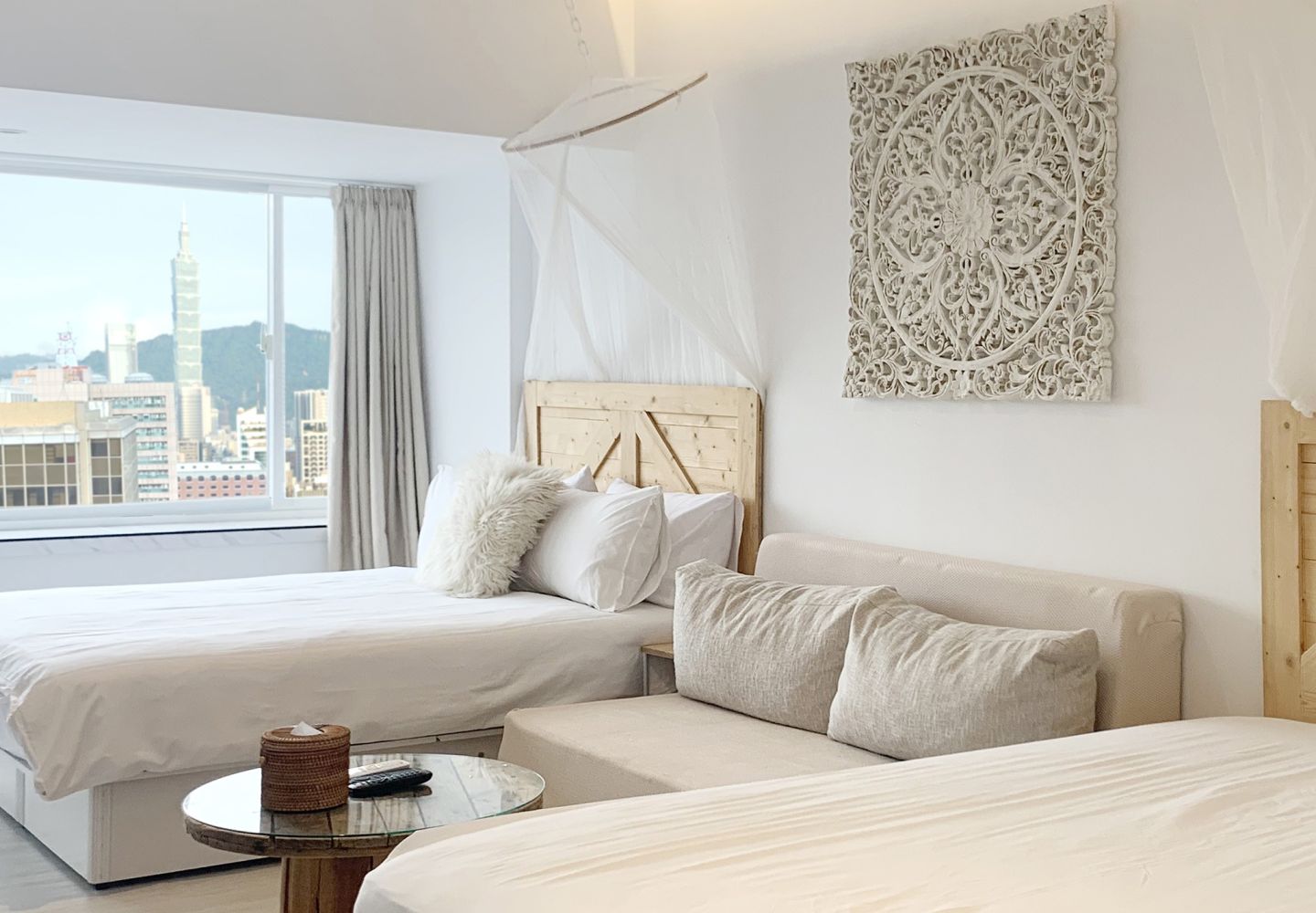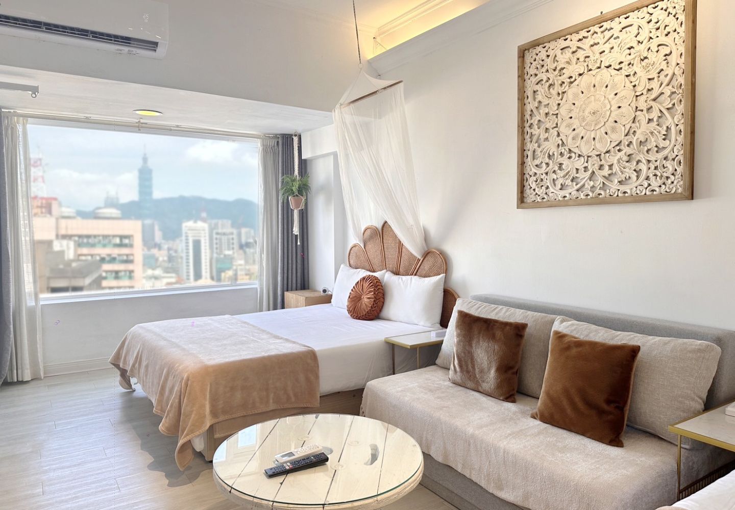 Enjoy breathtaking panoramic views from a high-floor suite—Taipei's skyline by day, and the iconic Taipei 101 light show by night. The room features a cozy queen bed and private bathroom, perfect for romantic getaways and special occasions.