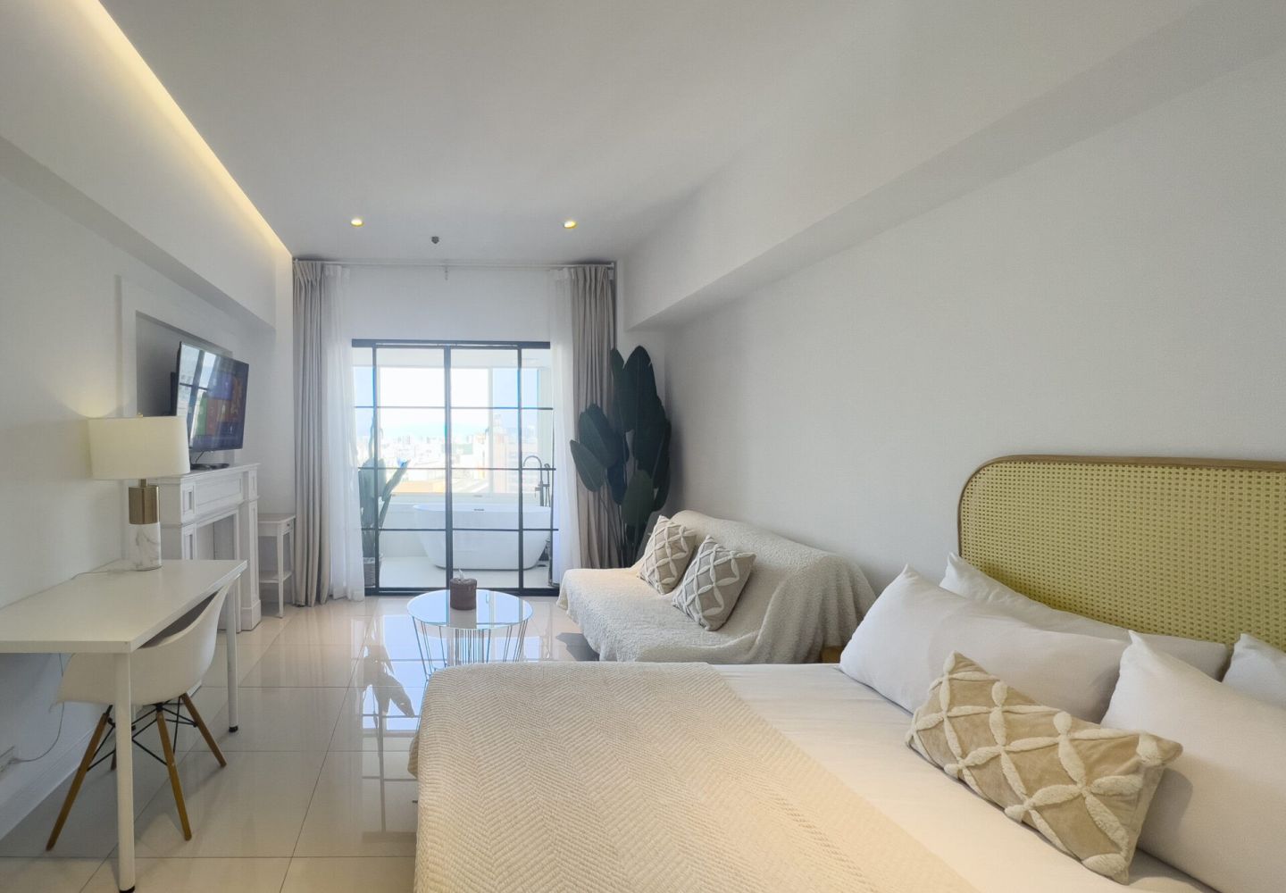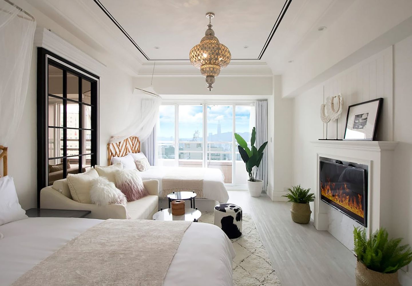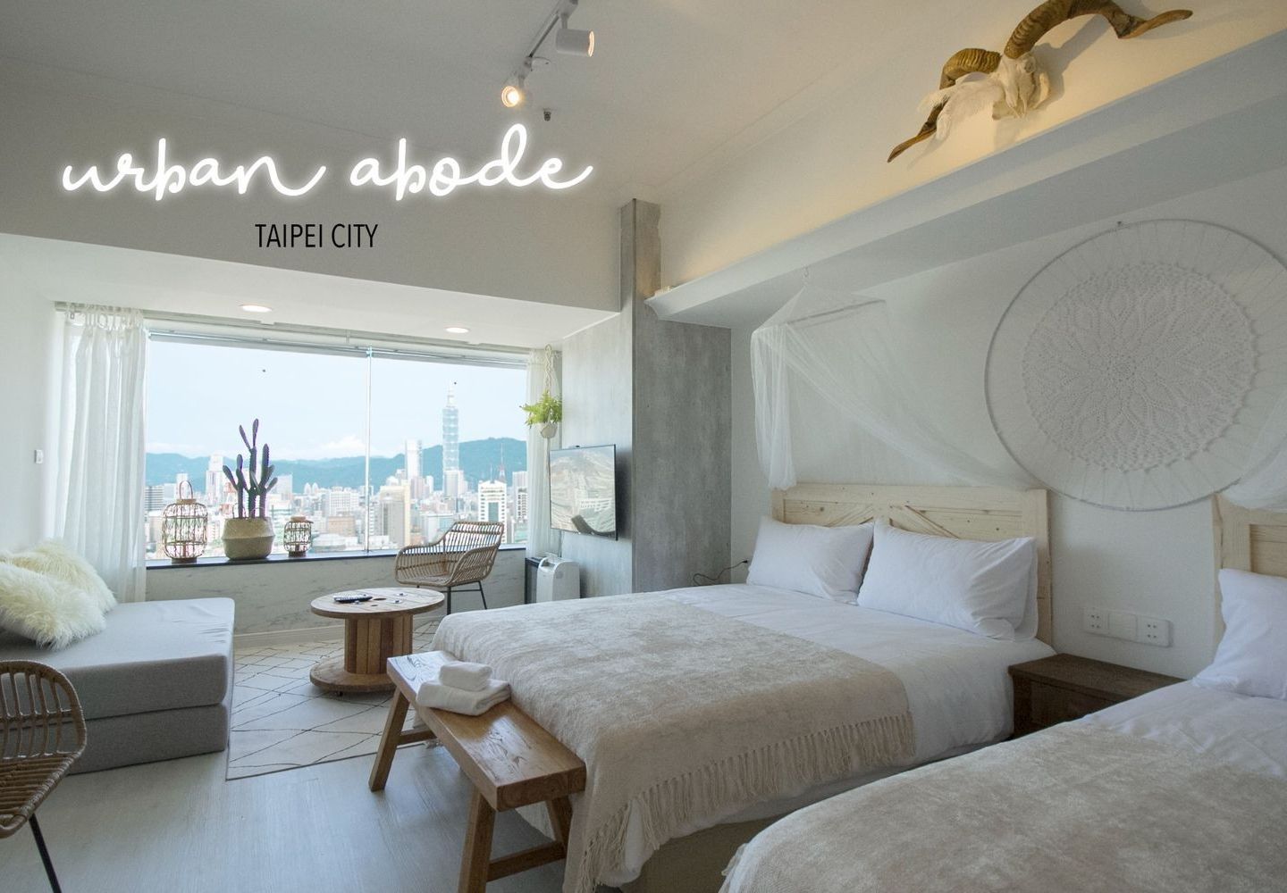 Enjoy breathtaking panoramic views from a high-floor suite—Taipei's skyline by day, and the iconic Taipei 101 light show by night. The room features a cozy queen bed and private bathroom, perfect for romantic getaways and special occasions.
