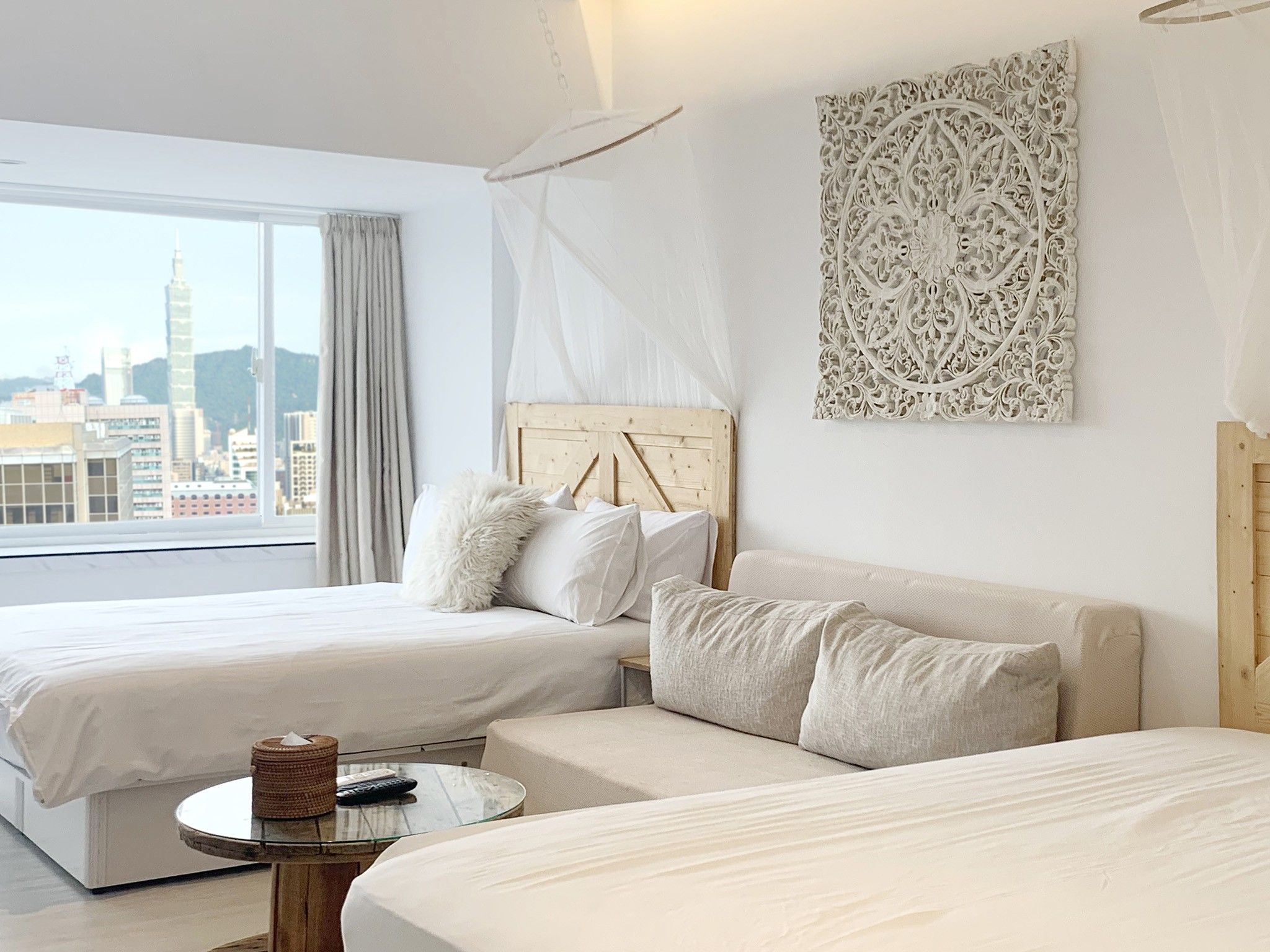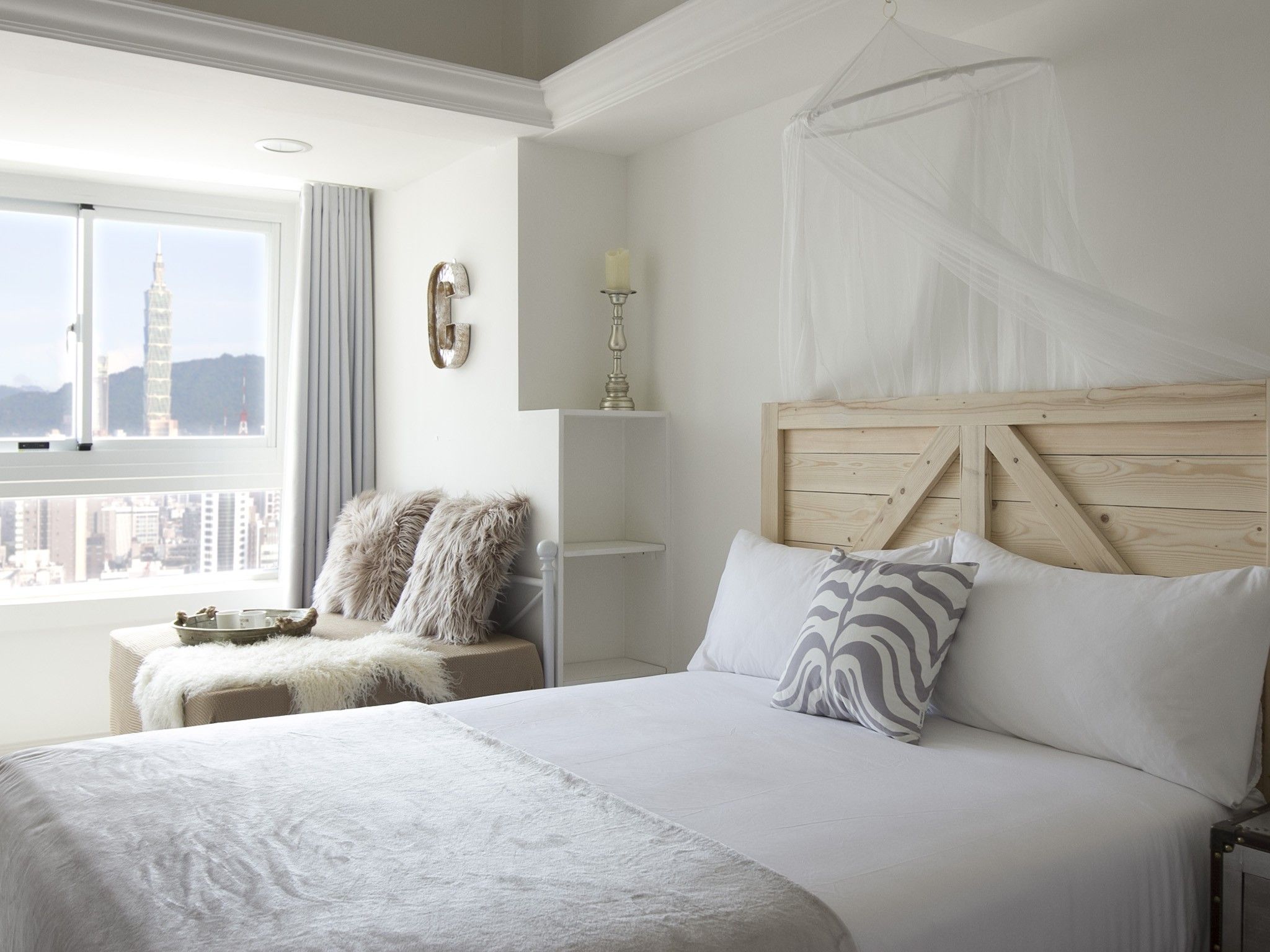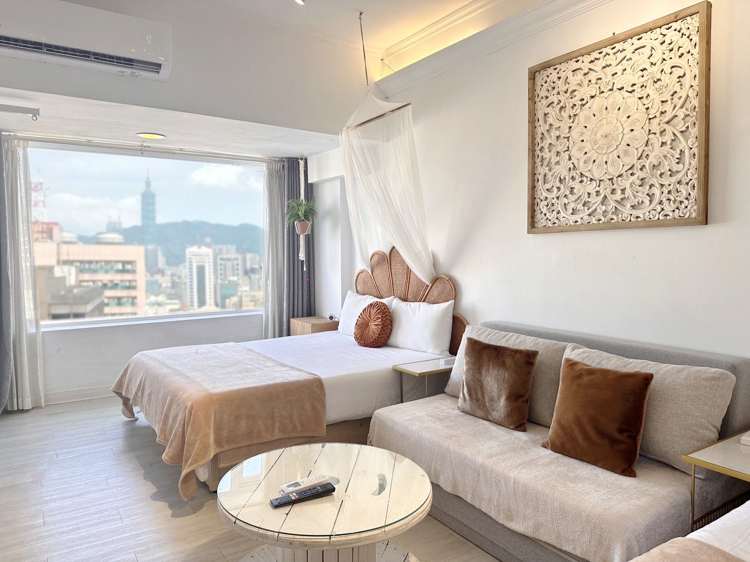 Enjoy breathtaking panoramic views from a high-floor suite—Taipei's skyline by day, and the iconic Taipei 101 light show by night. The room features a cozy queen bed and private bathroom, perfect for romantic getaways and special occasions.